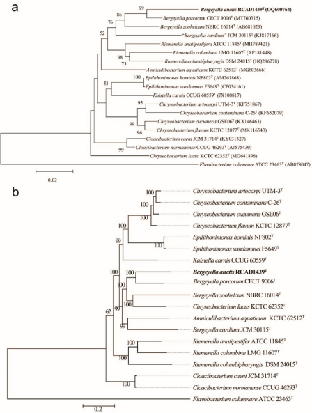 图 基于鸭伯杰菌RCAD1439T的16S rRNA基因及全基因组序列构建的系统发育树